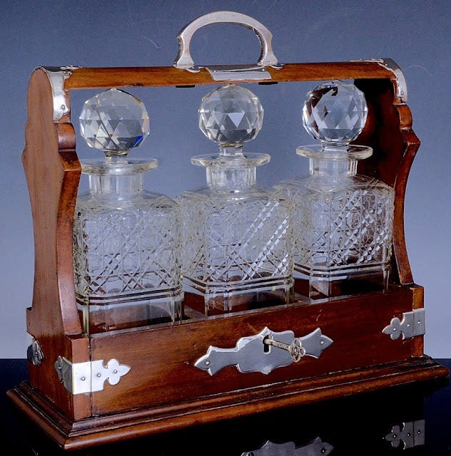 As you know, the English word “tantalize,” meaning to tempt or torment with the sight of something desired but out of reach. For Victorian or Edwardian antique hunters, the tantalus is a wooden rack of decanters secured by a lock; the idea was that servants would be unable to enjoy the nectar of their employers.